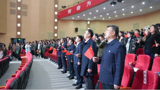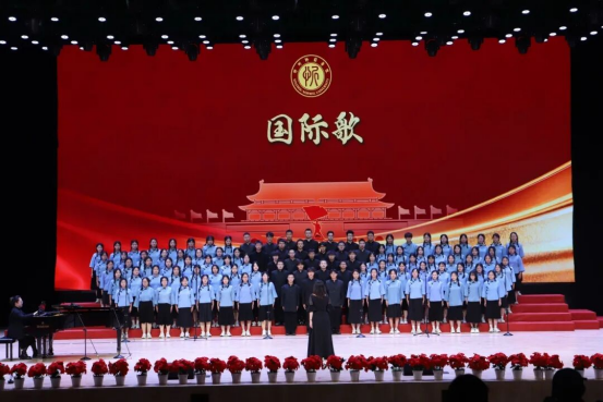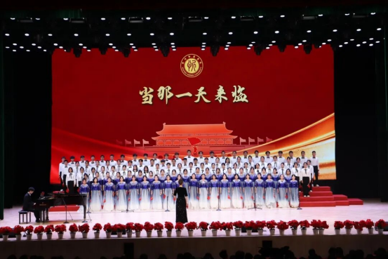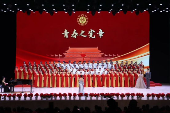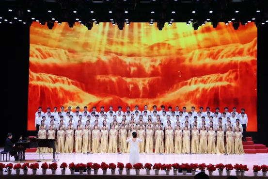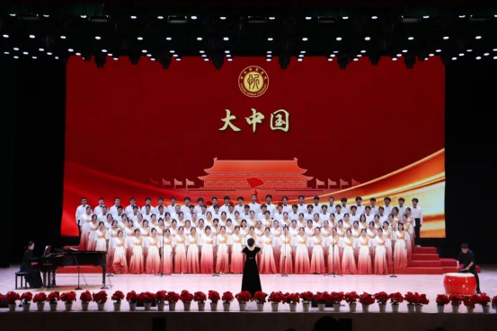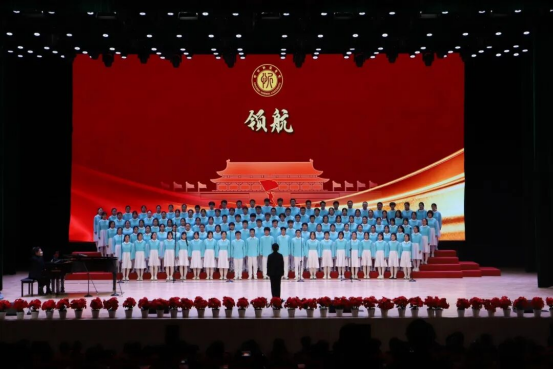 教师教育实训中心报告厅内灯光璀璨、庄重典雅,鲜艳的红色主题背景与熠熠生辉的校徽标识交相辉映,第十七届校园科技文化艺术节主题“青春为中国式现代化挺膺担当”格外醒目。场内师生济济一堂,热烈掌声与“歌唱祖国”的激昂歌声交融,奏响了铭记历史、开创未来的精神共鸣。